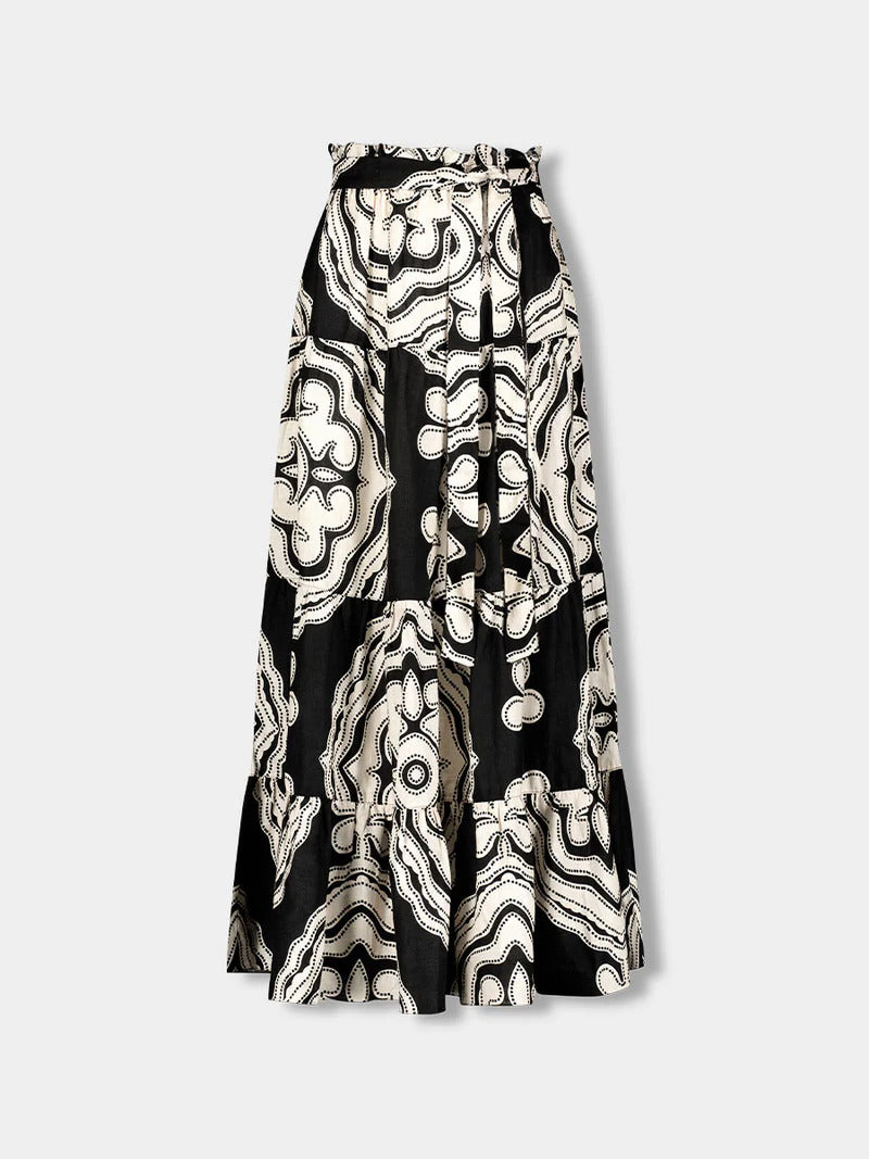 Long skirt features an adjustable tie belt that sits on the natural waist allowing for adjustable fits